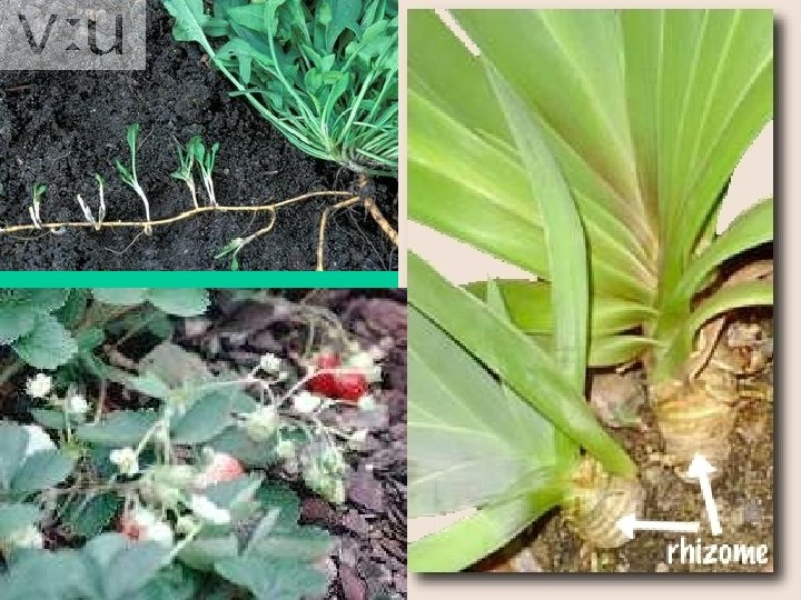 Asexual Reproduction • Vegetative reproduction • From some vegetative organ rather than from the flower • Includes roots, stems, leaves • Part takes root and grows into a “clone” of the parent plant • Strawberries and spider plants produce runners over the ground, irises and ferns produce rhizomes underground, daffodils and hyacinths produce daughter bulbs and potatoes produce daughter tubers.
