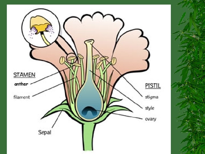 Male Parts of the Flower Stamen- Makes up all male parts Pollen- Male sex cell, similar to sperm Anther- Sac-like structure on top of the filament Filament- Short stalk that holds the anther