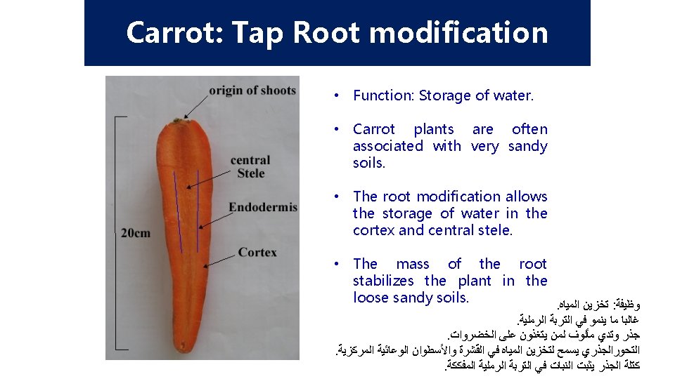 Root Modifications: Storage Roots ﺟﺬﻭﺭ ﺗﺨﺰﻳﻨﻴﺔ Storage roots Raphanus sativus, Radish Storage roots, Sweet potato