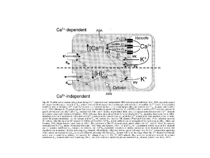ABA-induced stomata closure 1) Ca 2+ dependent ABA phospholipase C Ins 3 P Ca 2+ inhibition of K+in, activation of K+out ABA ADP ribose Ca 2+ inhibition of K+in, activation of K+out ABA G-proteiny Ca 2+ inhibition of K+in, activation of K+out 2) Ca 2+ independent ABA increase in p. H of cytoplasm inhibition of K+in, activation of K+out ABA inhibition of H+-ATPase membrane depolarization inhibition of K+in, activation of K+out ABA regulation of membrane proteins phosphorylation or dephosphorylation