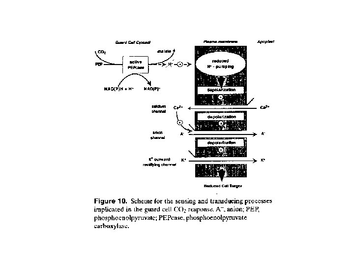 CO 2 concentration Response of stomata to CO 2 is in the dark as well as under irradiance, sensitivity under irradiance is higher Low CO 2 concentration stimulates stomata opening, high CO 2 concentration their closure Possible mechanisms: • a) increased ci decreased zeathin concentration in chloroplasts decreased ATPase activation less stomata opening • b) changes in Ca 2+ oscillation frequency (low CO 2 – higher frequency) • c) increased ci release of malate from mesophyll cell to apoplast activation of R-type anion channels stomata closure • d) increased ci increased malate production in guard cells leading to inhibition of H+ transport, membrane depolarization and stimulation of anion channels and K+out