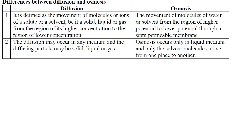 Diffusion • The movement of particles or molecules or ions from a region of higher concentrations to a region of lower concentration due to random kinetic motion of the particles • The rate of diffusion of gases is faster than liquids or solutes • The diffusing particles have a certain pressure called as the diffusion pressure (the potential ability of molecules or ions of any substance to diffuse from an area of their higher concentration to that of their low concentration) which is directly proportional to the number or concentration of the diffusing particles. • Therefore the diffusion takes place always from a region of higher diffusion pressure to a region of lower diffusion pressure i. e. , along a diffusion pressure gradient