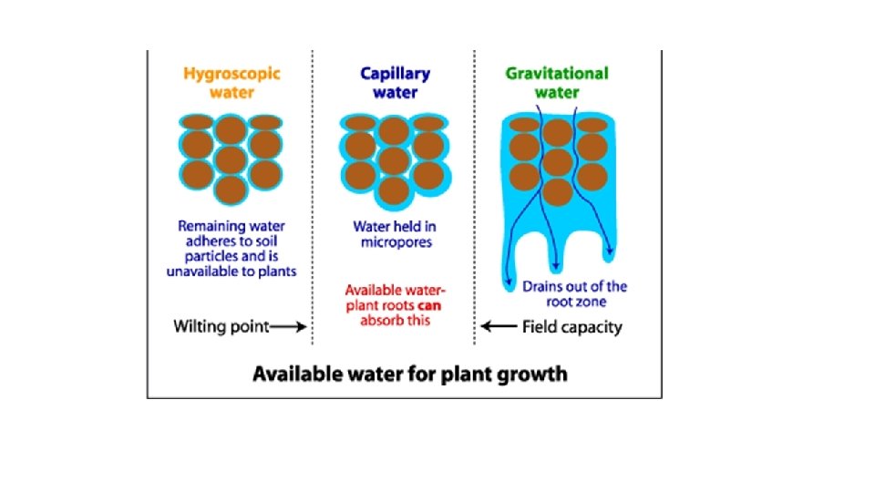 3. Hygroscopic or imbibed water • Hygroscopic water forms as a very thin film surrounding soil particles and is generally not available to the plant • This type of soil water is bound so tightly to the soil by adhesion properties that very little of it can be taken up by plant roots • Since hygroscopic water is found on the soil particles and not in the pores, certain types of soils with few pores (clays for example) will contain a higher percentage of it