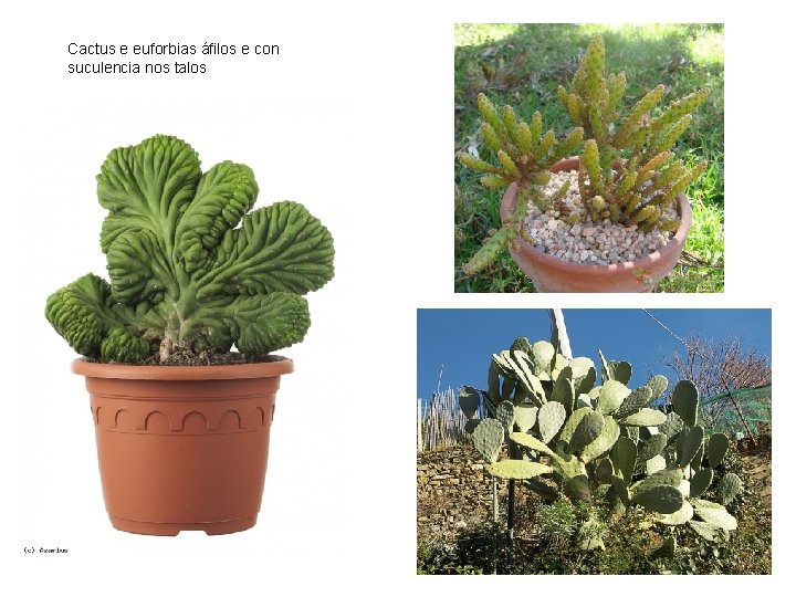 Desenvolvemento de suculencia. Para almacenar auga na raíz, no talo ou nas follas. As plantas suculentas, máis de 7. 000 especies, recollen auga durante os períodos de chuvia e almacénana para os tempos de seca. Reducen ao mínimo a transpiración e limitan a influencia da radiación solar con cubertas céreas pruinosas. Dous típicos exemplos de plantas suculentas: Os cactus almacenan a auga no talo e os ágaves nas follas.