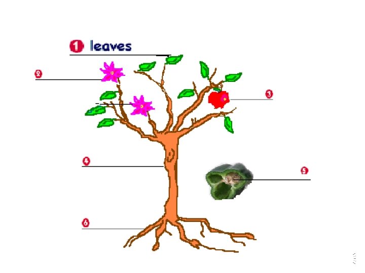 Plants have roots, stems or trunks, branches, leaves, flowers, and fruit. Roots Trunk Leaves Flower Branches Fruit