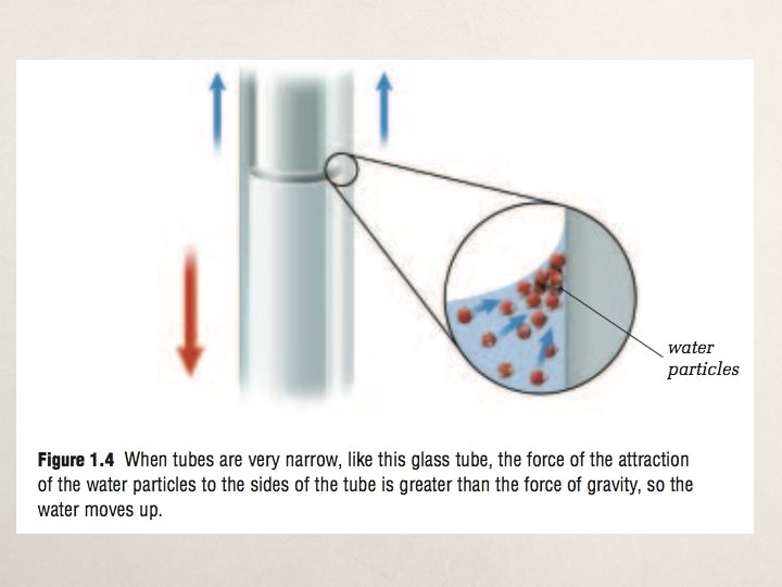 Capillary Action In this process, water travels from the roots to the leaves through tiny tubes in the roots and stems. Water particles are attracted to one another, and “stick” to one another, and they’re also attracted to the sides of the tiny tubes. These attractions helps move the water up inside the plant.