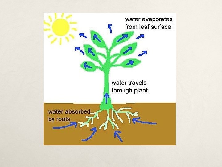 Transpiration: Main process that draws water up from a plant’s roots. Is the evaporation of water from the surface of the plant (mainly the leaves). As water particles evaporate from the surface of the leaves, more water particles move up with the plant to take their place. This process continues down through the plant with particles continually moving up from the roots.