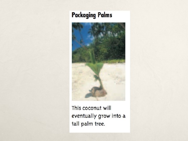 3 Main Parts The embryo Stored food Seed coat The embryo uses the stored food to survive until it begins to photosynthesize and produce its own food.