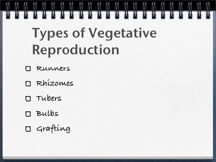 Reproduction Without Seeds? Vegetative Reproduction: Involves one parent and produces organisms that are genetically identical. Happens during less than “ideal” conditions.