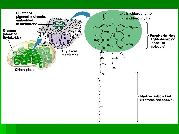 § The thylakoids contain the lightabsorbing pigments, such as chlorophyll a and b, and carotenoids and various enzymes. § The fluid stroma contains several enzymes involved in carbohydrate synthesis.