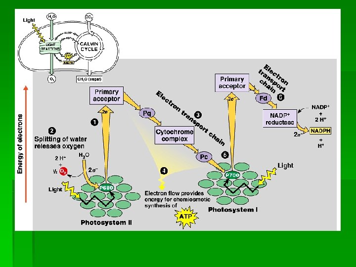 § Energized electrons are passed off to P 700 and then another primary electron acceptor. § Another, shorter, ETC, passes electrons along, terminating in the energy-rich coenzyme NADPH. (NADP+ and H+ are combined by the absorption of the electrons)