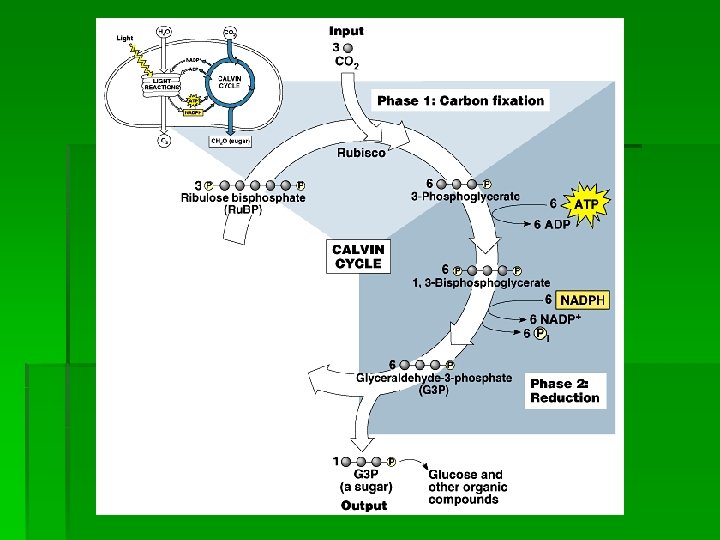 Light-independent reactions: Calvin-Benson cycle § “Fixes” CO 2 organic molecule § Uses energy in ATP and NADPH § Six turns of the cycle are needed to generate 1 glucose molecule, however, glucose is NOT the DIRECT result of this cycle.