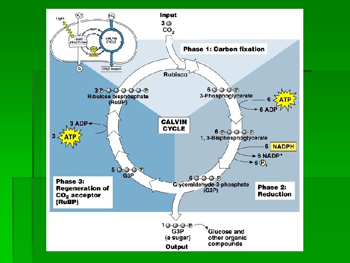 § Reduction – Each PGA receives an additional phosphate group from ATP and electrons from NADPH reducing it to G 3 P aka PGAL (also an intermediate of glycolysis). Several turns of the cycle are needed to continue……