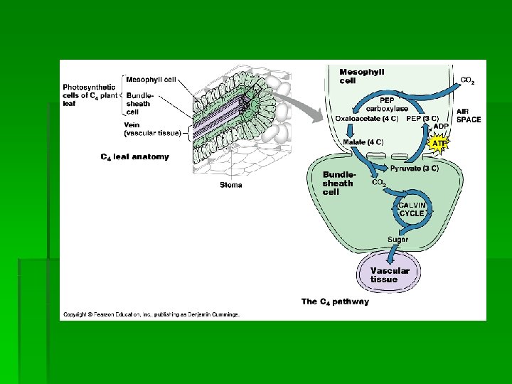 C 4 & Cam Photosynthesis § Certain plants have evolved a means of reducing the amount of photorespiration that can occur. § C 4 plants – carbon dioxide “fixes” to PEP (phosphoenolpyruvate) with the help of the enzyme PEP carboxylase to form OAA (oxaloacetate), a 4 C compound.