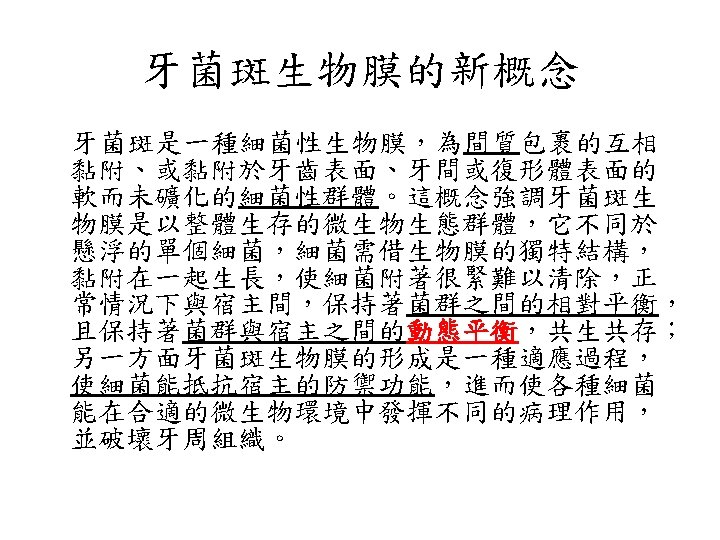 Non-specific plaque hypothesis (1986 Theilade) • The bacterial dental plaque that accumulates to around teeth is a relatively homogenous mass that causes periodontal disease when it accumulates to the point of overwhelming the host’s defense mechanisms • A result of the overall interaction of the microflora with the host • 從量的角度