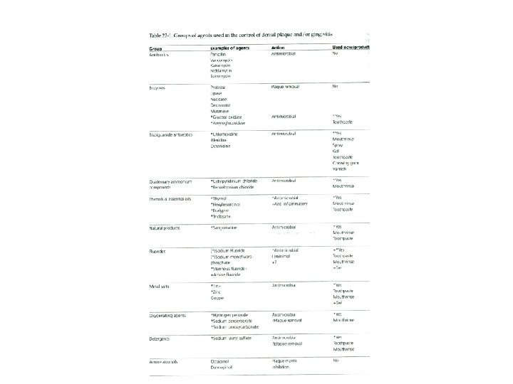 Chemical plaque control • • Antiadhesive Antimicrobial Plaque removal Antipathogenic