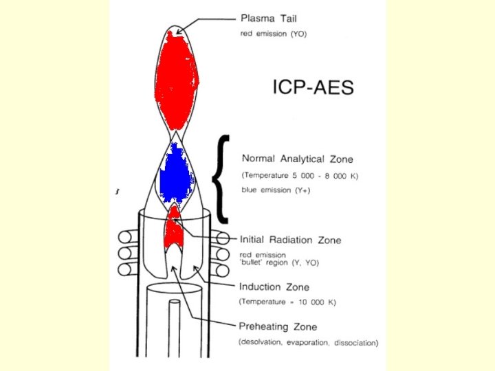 • NORMAL ANALYTICAL ZONE (NAZ) – ion formation occurs – usually +1 and +2 • TAIL OR PLUME – atoms can recombine to polyatomics • An yttrium salt can be used to visually locate these regions of the plasma • IRZ – red NAZ – blue tail – red