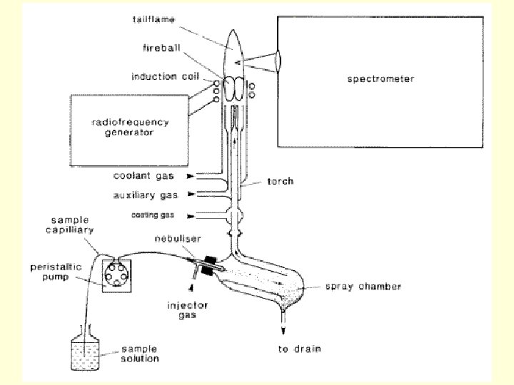 • For an ICP torch, the plasma is initiated by application of sparks from a Tesla coil. • The plasma is propagated by means of an induction coil. • The applied rf produces a fluctuating magnetic field. • Ions flow and their resistance to flow generates heat. • Temperataures can reach 6, 000 k – 10, 000 K. • Argon cooling is absolutely imperative.