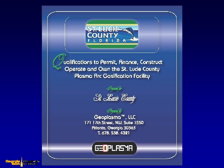 Planned St. Lucie County, FL GEOPLASMA Project • 3, 000 TPD of MSW from County and landfill • 6 gasifier units @ 500 TPD each – Up to 6 plasma torches per cupola – Power levels of 1. 2 to 2. 4 MW per torch • Energy Production – ~160 MW electricity with net of ~120 MW to grid • power for ~98, 000 households – Steam sold to local industries • Rock-like vitrified residue salable as construction aggregate