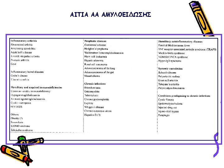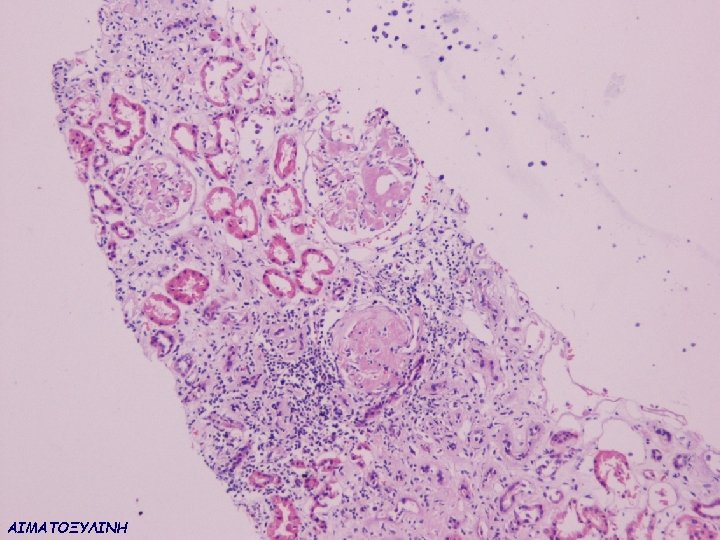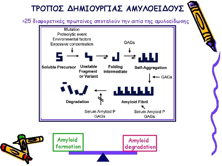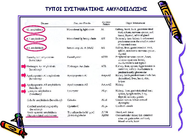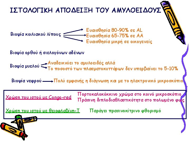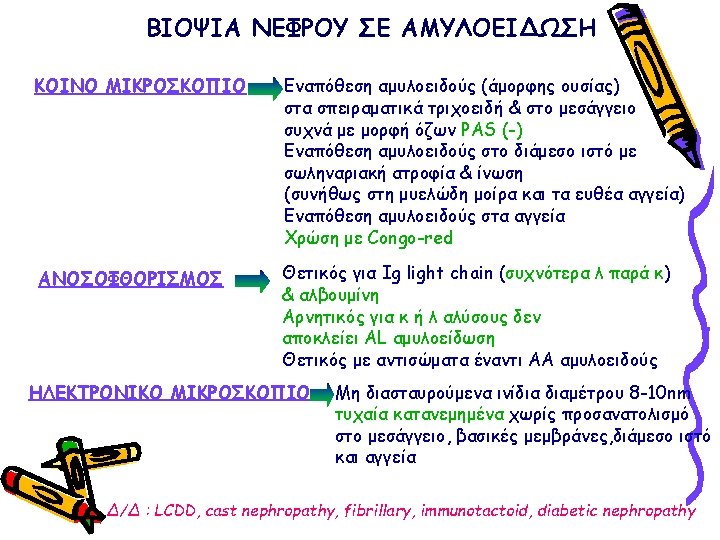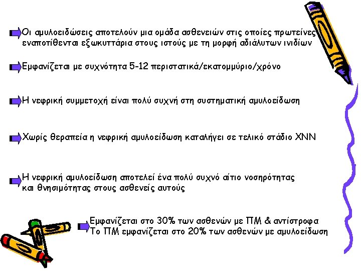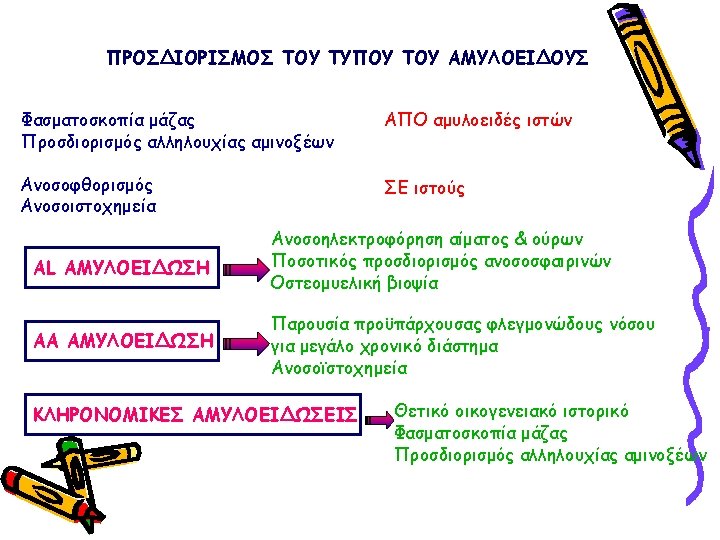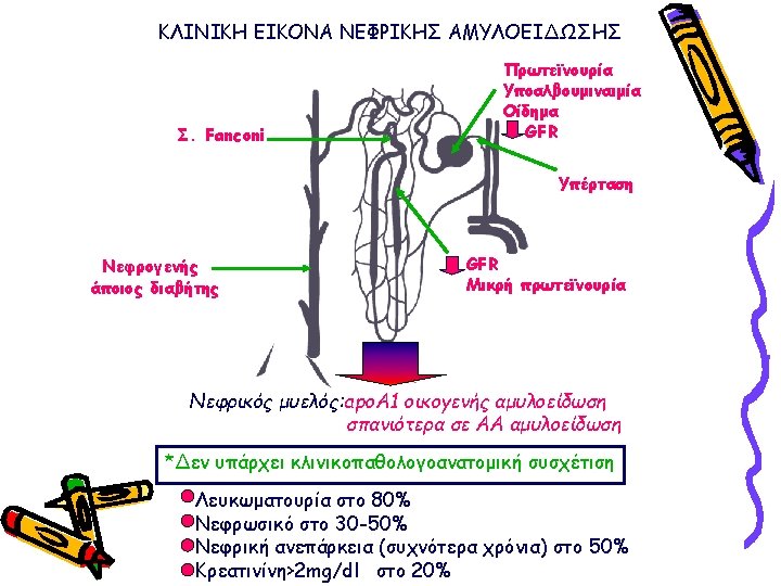 ΠΑΡΑΓΟΝΤΕΣ ΚΑΘΟΡΙΣΜΟΥ ΤΗΣ ΕΝΑΠΟΘΕΣΗΣ ΑΜΥΛΟΕΙΔΟΥΣ ΣΤΟ ΝΕΦΡΟΣ ΑΑ, AL, Fibrinogen, Lysozyme, apo. AII, apo. AI Small difference in amino-acid sequence (for familial amyloidosis) Uptake by mesangial cells (for light chains) Negative charge of the glomerular basement membrane Glycosaminoglycan content of the glomerular basement membrane Presence of proteases Local p. H Function of the amyloidogenic protein