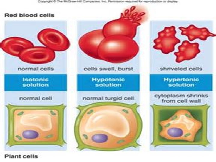 water will move rapidly into or out of the cell by osmosis, Solutions with concentrations equal to the concentration of the cytoplasm are described as isotonic. -A solution that is less concentrated than the intracellular fluid is described as hypotonic. a cell placed in a hypotonic solution draws water in, swells and may burst. -If a cell is placed in a hypertonic solution, which is high concentrated than the cellular fluid, it loses water to the surrounding fluids and shrinks, A plant cell in a hypertonic solution undergoes plasmolysis (shrinking of the cytoplasm) and the plant often wilts.