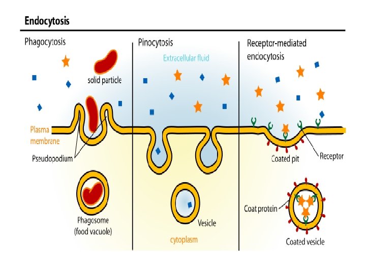 Endocytosis and Exocytosis The movement of macromolecules such as proteins or polysaccharides into or out of the cell is called bulk transport. There are two types of bulk transport, exocytosis and endocytosis and both require of energy (ATP). 2 -Endocytosis, is the process by which materials move into the cell. There are three types of endocytosis: phagocytosis, pinocytosis, and receptormediated endocytosis. In phagocytosis or “cellular eating, ” the cell’s plasma membrane surrounds a macromolecule or even an entire cell from the extracellular environment and buds off to form a food vacuole or phagosome (vacuole in the cytoplasm of a cell, containing a phagocytosed particle enclosed within a part of the cell membrane), The newly-formed phagosome then fuses with a lysosome whose hydrolytic enzymes digest the “food” inside.