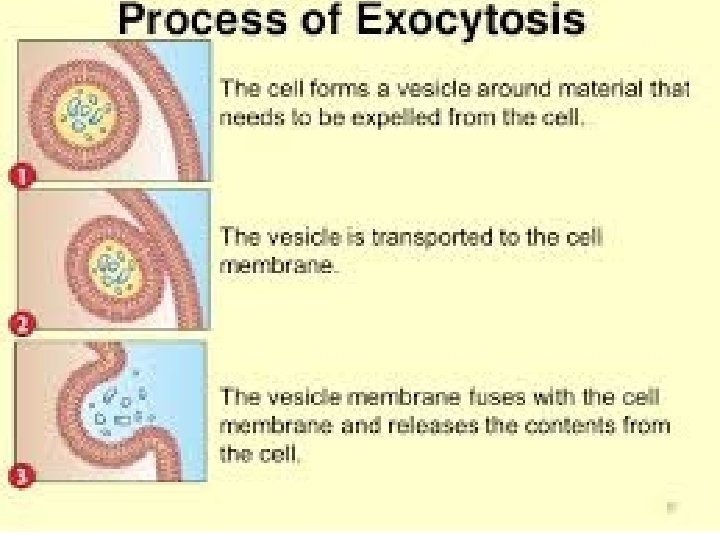 3 -Exocytosis In exocytosis, materials are exported out of the cell via secretory vesicles. In this process, the Golgi complex packages macromolecules into transport vesicles that travel to and fuse with the plasma membrane. This fusion causes the vesicle to spill its contents out of the cell. Exocytosis is important in expulsion of waste materials out of the cell and in the secretion of cellular products such as digestive enzymes or hormones.