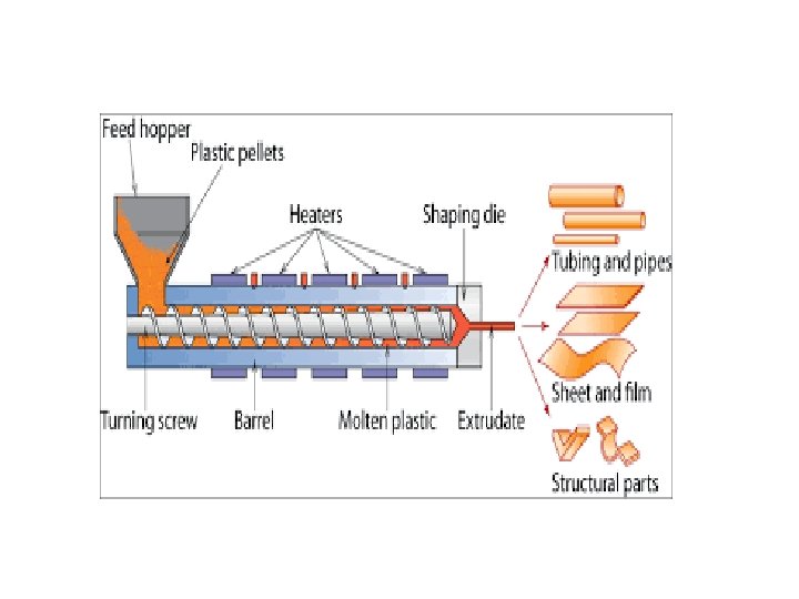 Extrusion q. Compression process in which material is forced to flow through a die orifice to provide long continuous product whose cross-sectional shape is determined by the shape of the orifice. q Widely used for thermoplastics and elastomers to mass produce items such as tubing, pipes, hose, structural shapes, sheet and film, continuous filaments, and coated electrical wire. q Carried out as a continuous process; extrudate is then cut into desired lengths.