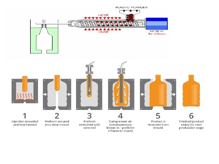 Blow moulding q Molding process in which air pressure is used to inflate soft plastic into a mold cavity. q. Important for making one-piece hollow plastic parts with thin walls, such as bottles. q Because these items are used for consumer beverages in mass markets, production is typically organized for very high quantities