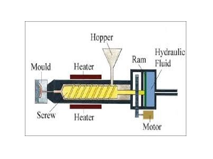 Injection Moulding q. Polymer is heated to a highly plastic state and forced to flow under high pressure into a mold cavity where it solidifies and the molding is then removed from cavity. q Produces discrete components almost always to net shape. q Typical cycle time 10 to 30 sec, but cycles of one minute or more are not uncommon. q Mold may contain multiple cavities, so multiple moldings are produced each cycle