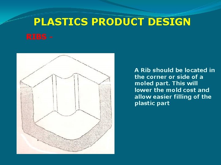 PLASTICS PRODUCT DESIGN RIBS - A Rib should be located in the corner or side of a moled part. This will lower the mold cost and allow easier filling of the plastic part