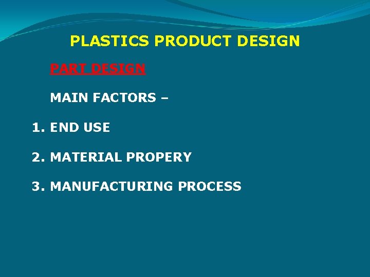 PLASTICS PRODUCT DESIGN PART DESIGN MAIN FACTORS – 1. END USE 2. MATERIAL PROPERY 3. MANUFACTURING PROCESS
