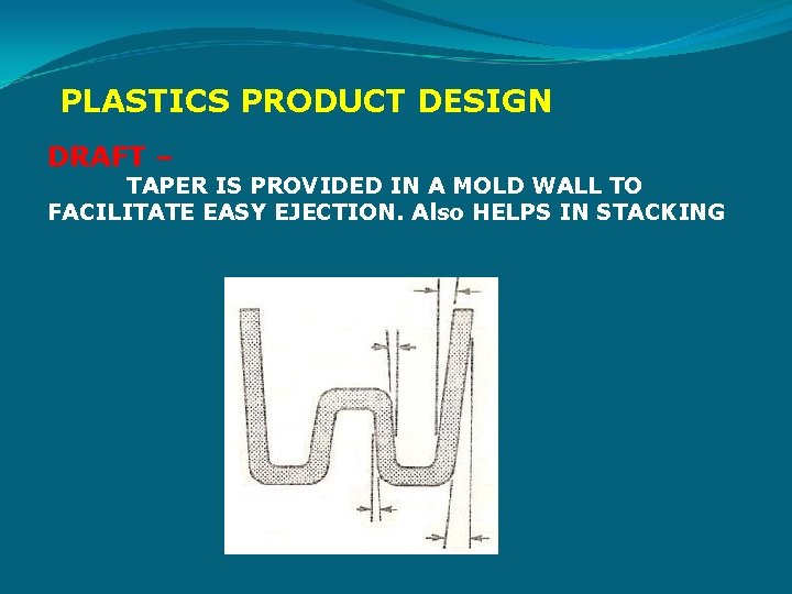 PLASTICS PRODUCT DESIGN DRAFT – TAPER IS PROVIDED IN A MOLD WALL TO FACILITATE EASY EJECTION. Also HELPS IN STACKING