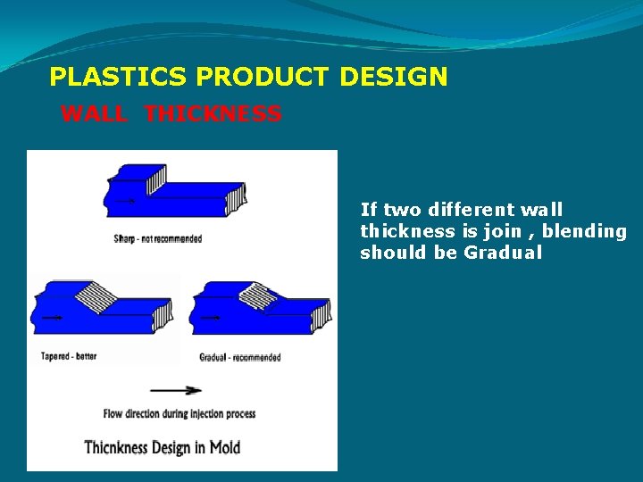 PLASTICS PRODUCT DESIGN WALL THICKNESS If two different wall thickness is join , blending should be Gradual