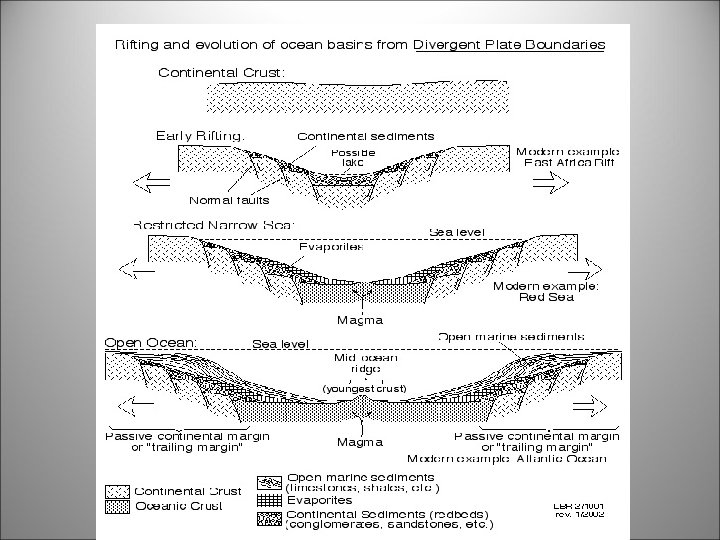 3 types of plate boundaries • Divergent boundaries: – 2 plates moving away from each other – As the plates move apart, magma rises, fills in the space between the plates, and hardens – Mostly found on the ocean floor – Features: Ridges and Rifts – Ex. Red Sea, Mid-Atlantic Ridge, East African Rift Valley