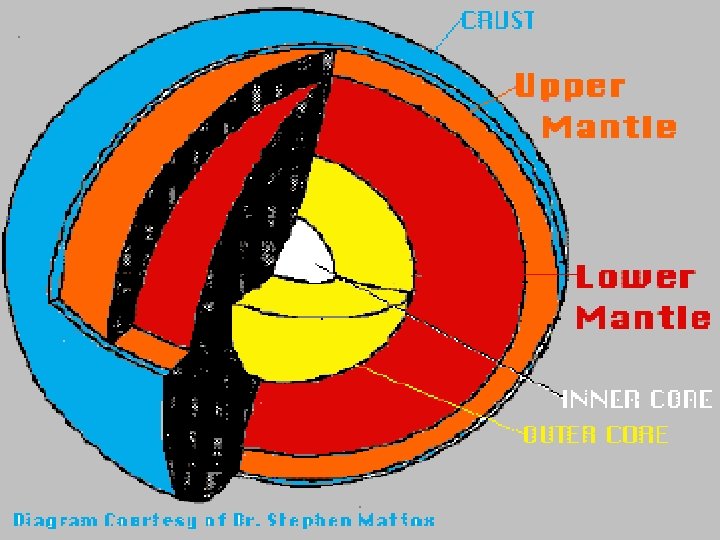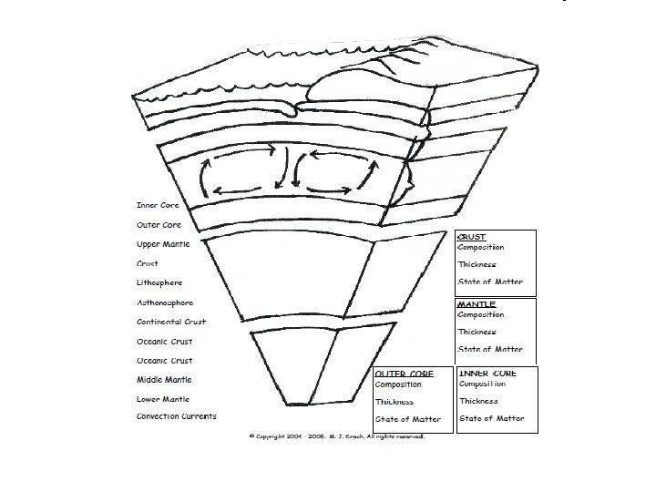 Layers of the Earth Crust- Mantle- Rigid, rocky outer surface of Earth Oceanic crustbasalt Continental crust- granite -crust is thinner under oceans and thicker under Rocky layer located 1. Outer core -Liquid layer made of Iron under the crust -composed of Si, O, and Nickel 2. Inner core- center Mg, Fe, and Al. of Earth- It is -convection currents carry heat Solid (Fe & Ni), extremely hot and inner mantle to under great pressure upper mantle continents Core-