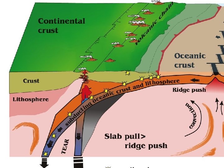 Ridge Push and Slab Pull • Ridge Push – heat rising pushes crust at a ridge toward a trench. • Slab Pull – cooler material sinking pulls oceanic crust down into a subduction zone (trench)