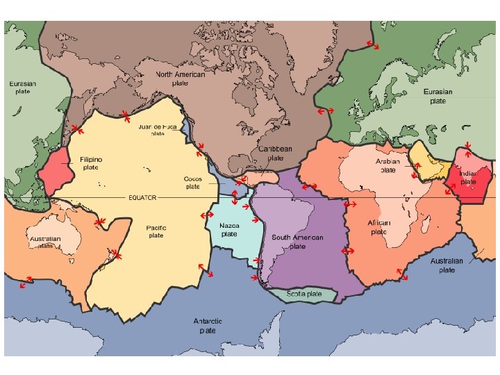 • There about 8 major plates and nine minor ones. • The major plates include both continents and oceans. • The number of plates and their sizes, shapes, and motions have changed throughout Earth's history. . . and continue to do so today. • Different plates move at different speeds. What plate are we riding on?