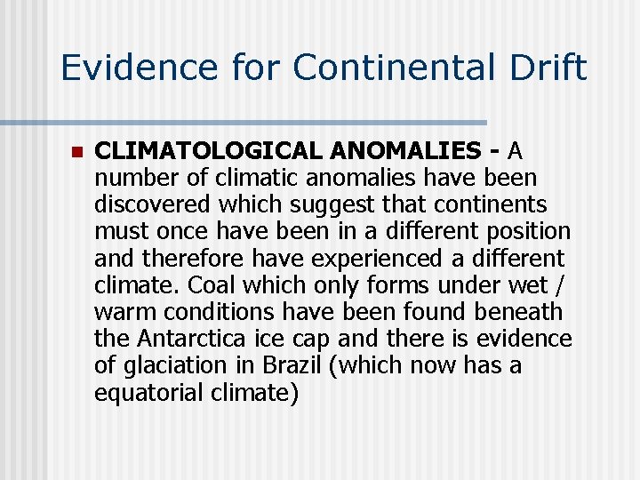 Evidence for Continental Drift n CLIMATOLOGICAL ANOMALIES - A number of climatic anomalies have been discovered which suggest that continents must once have been in a different position and therefore have experienced a different climate. Coal which only forms under wet / warm conditions have been found beneath the Antarctica ice cap and there is evidence of glaciation in Brazil (which now has a equatorial climate)
