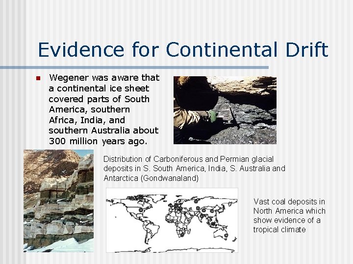 Evidence for Continental Drift n Wegener was aware that a continental ice sheet covered parts of South America, southern Africa, India, and southern Australia about 300 million years ago. Distribution of Carboniferous and Permian glacial deposits in S. South America, India, S. Australia and Antarctica (Gondwanaland) Vast coal deposits in North America which show evidence of a tropical climate