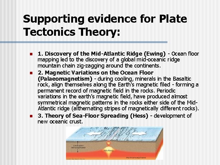 Supporting evidence for Plate Tectonics Theory: n n n 1. Discovery of the Mid-Atlantic Ridge (Ewing) - Ocean floor mapping led to the discovery of a global mid-oceanic ridge mountain chain zig-zagging around the continents. 2. Magnetic Variations on the Ocean Floor (Palaeomagnetism) - during cooling, minerals in the Basaltic rock, align themselves along the Earth's magnetic filed - forming a permanent record of magnetic field in the rocks. Periodic variations in the earth's magnetic field, have produced almost symmetrical magnetic patterns in the rocks either side of the Mid. Atlantic ridge (althernating stripes of magnetically different rocks). 3. Theory of Sea-Floor Spreading (Hess) - development of new oceanic crust.