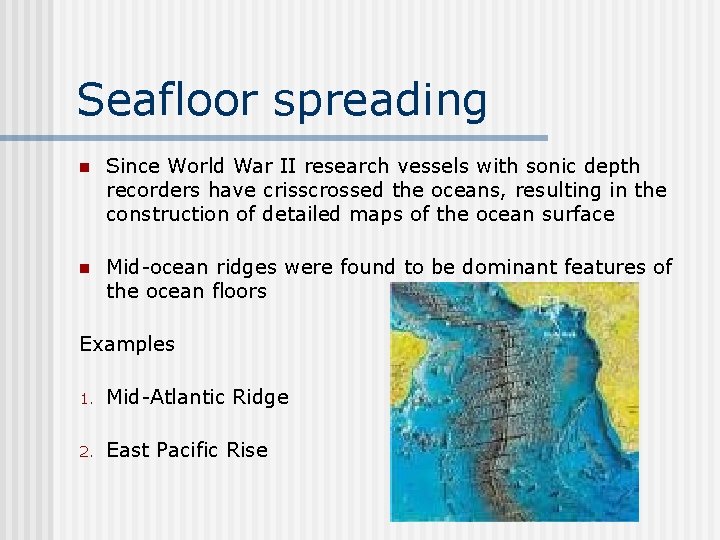 Seafloor spreading n Since World War II research vessels with sonic depth recorders have crisscrossed the oceans, resulting in the construction of detailed maps of the ocean surface n Mid-ocean ridges were found to be dominant features of the ocean floors Examples 1. Mid-Atlantic Ridge 2. East Pacific Rise