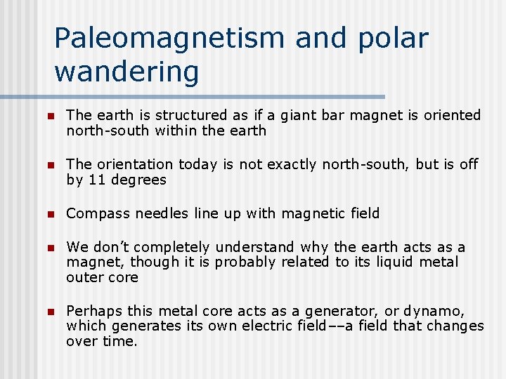 Paleomagnetism and polar wandering n The earth is structured as if a giant bar magnet is oriented north-south within the earth n The orientation today is not exactly north-south, but is off by 11 degrees n Compass needles line up with magnetic field n We don’t completely understand why the earth acts as a magnet, though it is probably related to its liquid metal outer core n Perhaps this metal core acts as a generator, or dynamo, which generates its own electric field––a field that changes over time.