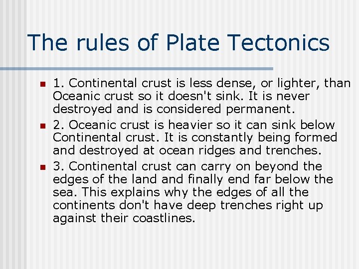 The rules of Plate Tectonics n n n 1. Continental crust is less dense, or lighter, than Oceanic crust so it doesn't sink. It is never destroyed and is considered permanent. 2. Oceanic crust is heavier so it can sink below Continental crust. It is constantly being formed and destroyed at ocean ridges and trenches. 3. Continental crust can carry on beyond the edges of the land finally end far below the sea. This explains why the edges of all the continents don't have deep trenches right up against their coastlines.