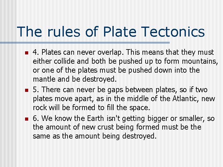 The rules of Plate Tectonics n n n 4. Plates can never overlap. This means that they must either collide and both be pushed up to form mountains, or one of the plates must be pushed down into the mantle and be destroyed. 5. There can never be gaps between plates, so if two plates move apart, as in the middle of the Atlantic, new rock will be formed to fill the space. 6. We know the Earth isn't getting bigger or smaller, so the amount of new crust being formed must be the same as the amount being destroyed.