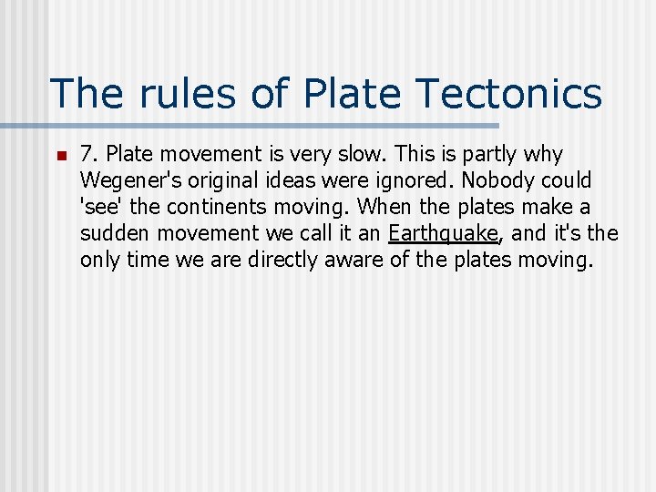 The rules of Plate Tectonics n 7. Plate movement is very slow. This is partly why Wegener's original ideas were ignored. Nobody could 'see' the continents moving. When the plates make a sudden movement we call it an Earthquake, and it's the only time we are directly aware of the plates moving.
