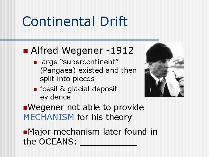 Continental Drift n Alfred Wegener -1912 n n large “supercontinent” (Pangaea) existed and then split into pieces fossil & glacial deposit evidence n. Wegener not able to provide MECHANISM for his theory n. Major mechanism later found in the OCEANS: ______