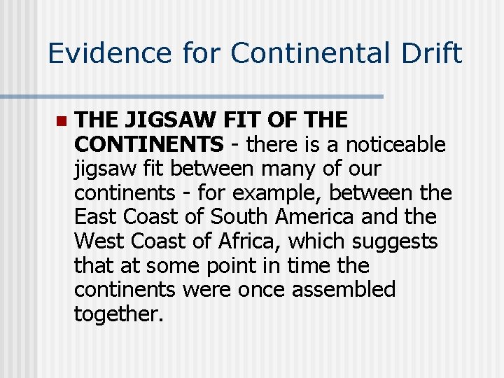 Evidence for Continental Drift n THE JIGSAW FIT OF THE CONTINENTS - there is a noticeable jigsaw fit between many of our continents - for example, between the East Coast of South America and the West Coast of Africa, which suggests that at some point in time the continents were once assembled together.