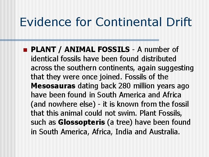 Evidence for Continental Drift n PLANT / ANIMAL FOSSILS - A number of identical fossils have been found distributed across the southern continents, again suggesting that they were once joined. Fossils of the Mesosauras dating back 280 million years ago have been found in South America and Africa (and nowhere else) - it is known from the fossil that this animal could not swim. Plant Fossils, such as Glossopteris (a tree) have been found in South America, Africa, India and Australia.