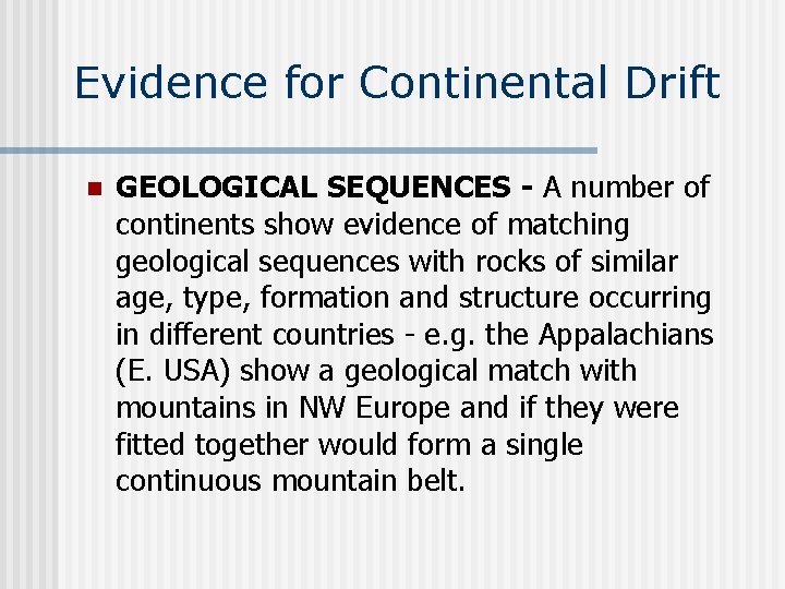 Evidence for Continental Drift n GEOLOGICAL SEQUENCES - A number of continents show evidence of matching geological sequences with rocks of similar age, type, formation and structure occurring in different countries - e. g. the Appalachians (E. USA) show a geological match with mountains in NW Europe and if they were fitted together would form a single continuous mountain belt.